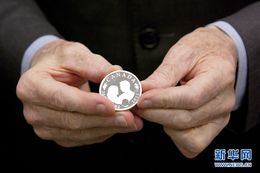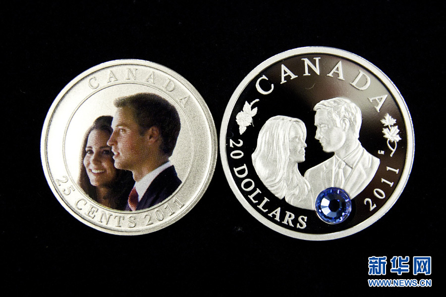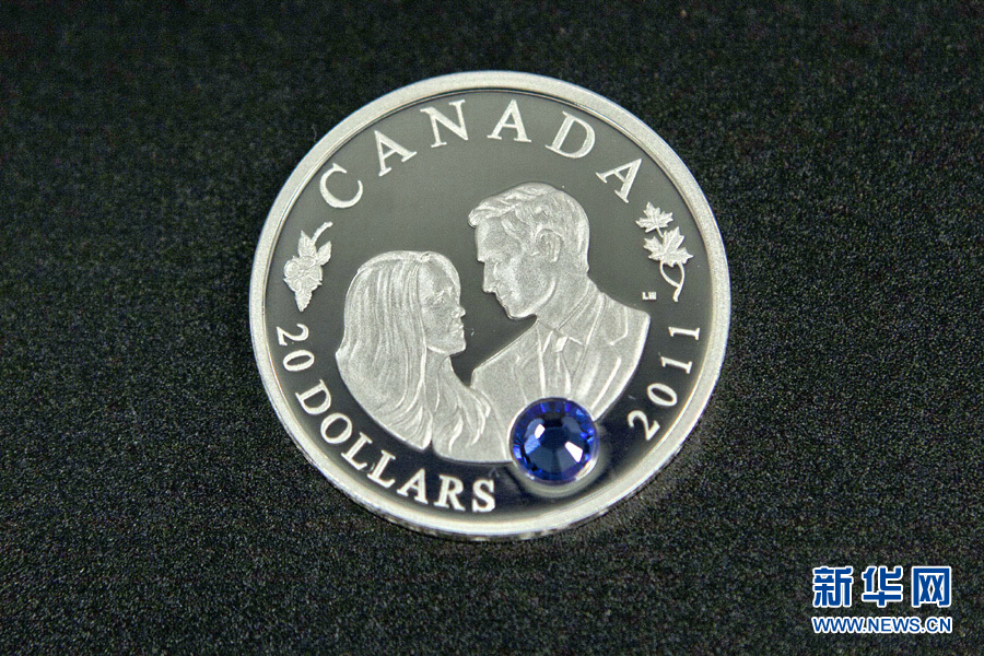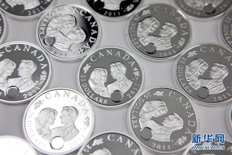 這是4月6日在加拿大皇家造幣廠拍攝的英國威廉王子結(jié)婚紀念幣。加拿大當天發(fā)行了英國威廉王子和未婚妻凱特·米德爾頓的結(jié)婚紀念幣。紀念幣共兩枚,面值分別為25加分和20加元。前者為鍍鎳鋼幣,印有兩人彩色照片;后者為純銀幣,鑲嵌一個象征兩人訂婚藍寶石戒指的寶石藍色水晶飾品。