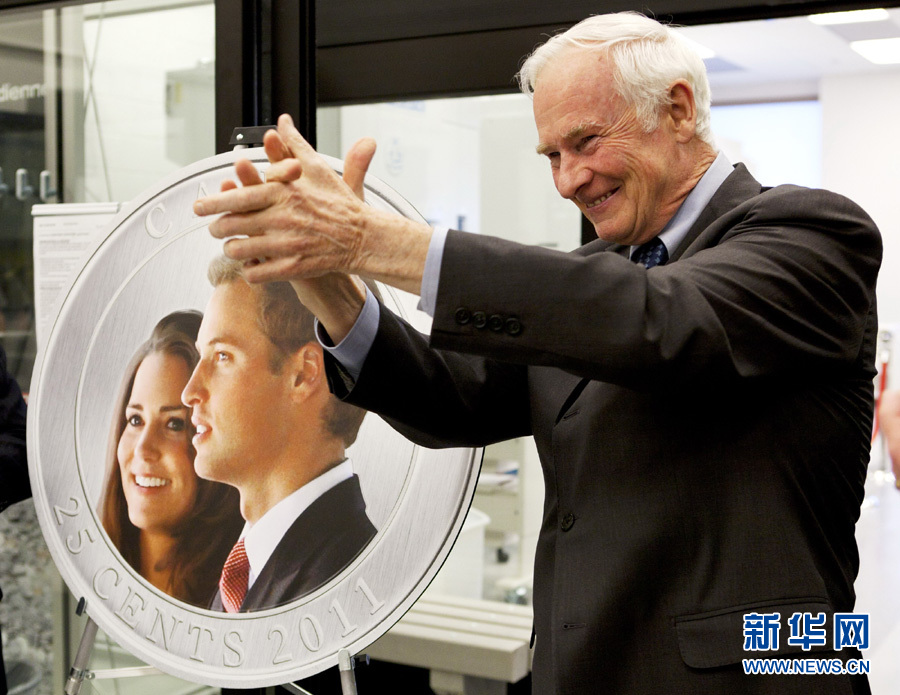 4月6日,在加拿大首都渥太華的加拿大皇家造幣廠,加拿大總督戴維·約翰斯頓展示英國威廉王子結(jié)婚紀念幣的一枚半成品。