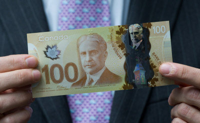 加拿大央行(The Bank of Canada)周一(20日)宣布,以特別聚合物制成的面額為100元的新幣將于今年11月發(fā)行并開始流通,這種塑膠鈔票幾乎難以偽造,而且更加經(jīng)久耐用。