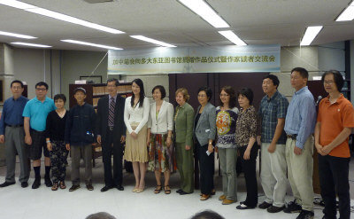 圖為加中華會(huì)捐書作家與多大圖書館總館長(zhǎng)Carole Moore(右七)、安省旅游暨文化部長(zhǎng)陳國(guó)治(左五)等合影。