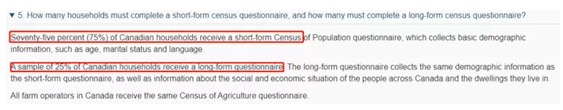| 25%的加拿大家庭將收到一份長(zhǎng)問卷調(diào)查,除了與短問卷相同的人口統(tǒng)計(jì)信息以外,還將包含社會(huì)、經(jīng)濟(jì)狀況,以及住房信息。 |