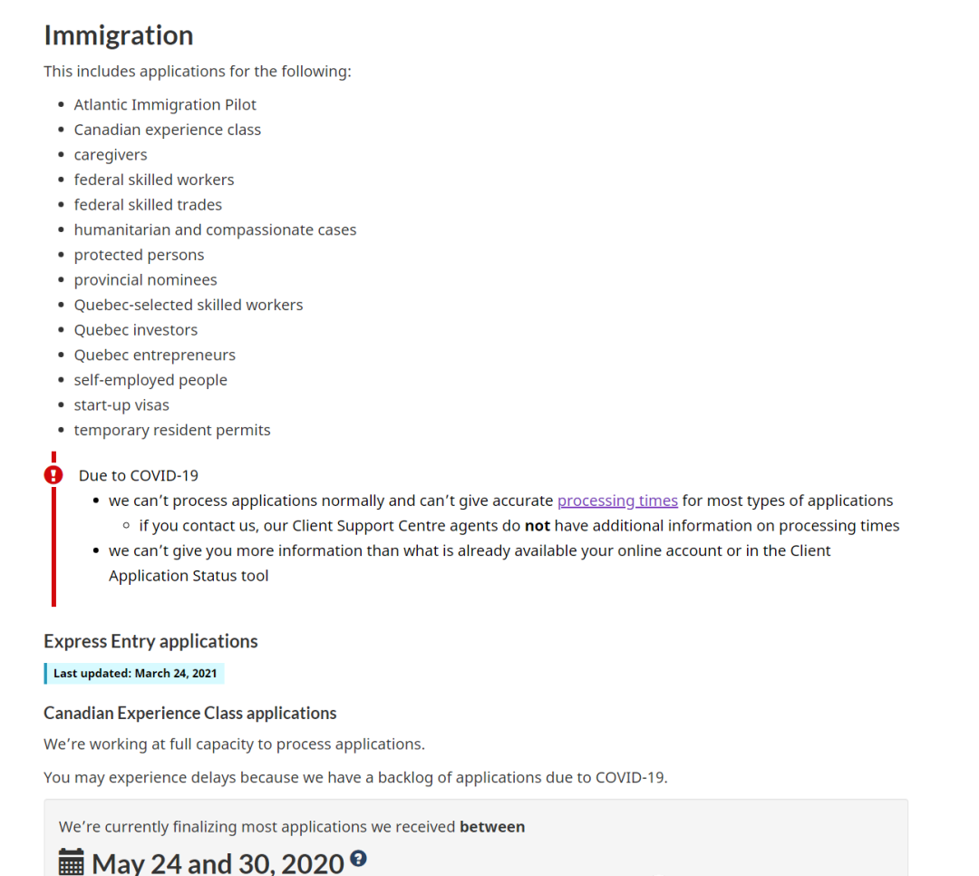截止到3月24日為止,IRCC表示,2020年5月24日至5月30日之間收到的大部分EE快速通道CEC申請,正在進行最后的審批流程。這意味移民局正在處理大約10個月前收到的EE申請,比預計的時間晚了4個多月。
