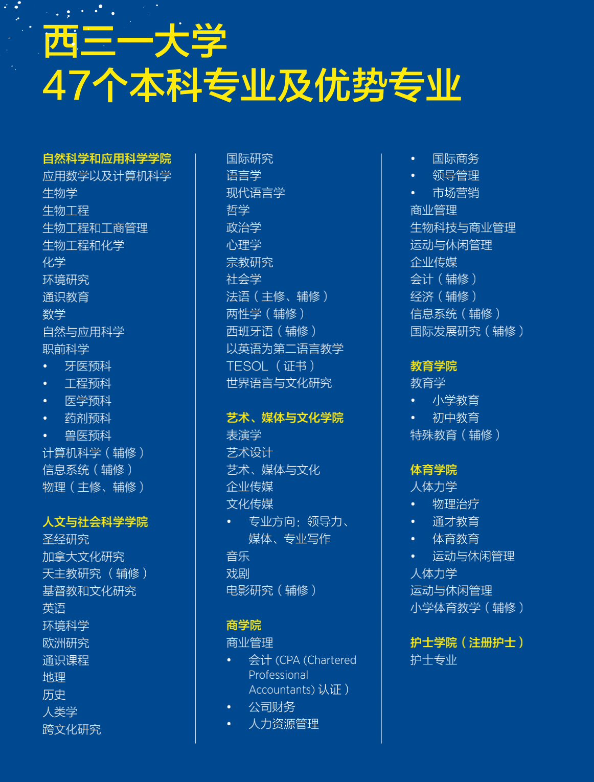 ♦ 專業(yè)設(shè)置:西三一大學(xué)有七大學(xué)院:商學(xué)院、教育學(xué)院、人類動力學(xué)/體育及休閑管理學(xué)院、護理學(xué)院、藝術(shù)/傳媒及文化學(xué)院和理工學(xué)院,提供47個本科專業(yè)及17個碩士專業(yè),其中絕大多數(shù)均可以申請無語言雙錄取。