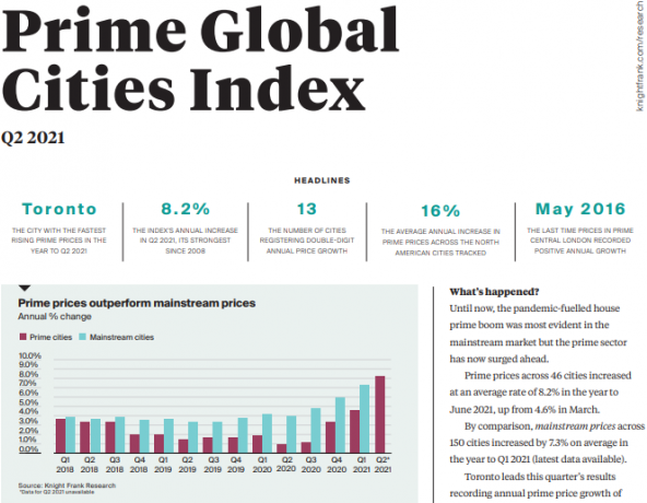 該機(jī)構(gòu)將這里的“主要(prime)”定義為在某個(gè)地點(diǎn)最想要居住的、最貴的物業(yè)。從今年上半年的數(shù)據(jù)來(lái)看,多倫多市的房?jī)r(jià)從第一季度到第二季度激增了15.5%,這也是榜上的40多個(gè)城市中,唯一一個(gè)在三個(gè)月期間增幅達(dá)兩位數(shù)的地區(qū)。