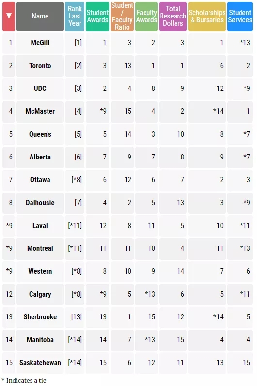 麥吉爾大學蟬聯(lián)榜首,前六名和去年相比均沒有變化。位于魁省的拉瓦爾大學(Laval University)和蒙特利爾大學今年進入前十名。