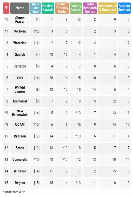 卑詩省的兩所大學:SFU與維多利亞大學并列第一,SFU更是已經(jīng)連續(xù)多年蟬聯(lián)榜首位置,滑鐵盧大學的第3名位置也沒有變化。