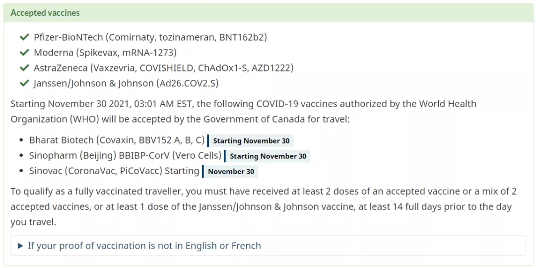 但需要注意的是,雖然加拿大政府已經(jīng)承認(rèn)了這兩款疫苗,但11月30日之后,疫苗認(rèn)可才會生效!