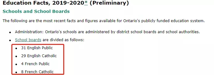 安大略省有天主教教育局和非天主教教育局兩種,根據(jù)Ontario Ministry of Education的統(tǒng)計(jì),截止2019-2020年度,安省有31個(gè)英語公立教育局,29個(gè)英語天主教教育局,4個(gè)法語公立教育局以及8個(gè)法語天主教教育局。