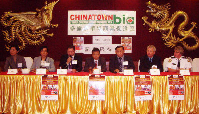 華埠商業(yè)促進(jìn)區(qū)和各界代表在記者會(huì)上宣布,第11屆中區(qū)華埠同樂(lè)日將與中秋節(jié)結(jié)合。左叁為朱偉邦,右叁為傅偉勇。