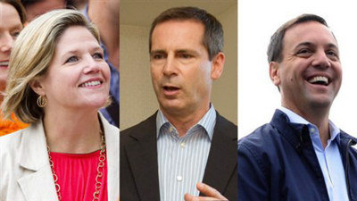 安省新民主黨領(lǐng)袖賀娃絲(從左到右)、自由黨領(lǐng)袖麥堅迪和保守黨領(lǐng)袖胡達克。