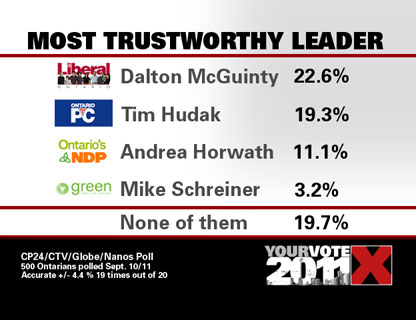 這項(xiàng)Nanos Research為CTV電視網(wǎng)絡(luò)、《環(huán)球郵報》及CP24電視臺所做的民意調(diào)查發(fā)現(xiàn),507名接受調(diào)查的選民中,24.1%的人不能確定“誰是最值得信任的政治領(lǐng)導(dǎo)人”。