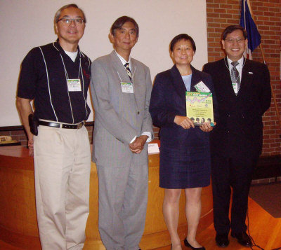 安省培正同學(xué)會(huì)前會(huì)長施永輝(左二)、展望青年領(lǐng)袖培訓(xùn)計(jì)劃代表李樹德(左一)、烈治文山市議員陳志輝(右一)和專題演講人李金艷(右二)合影