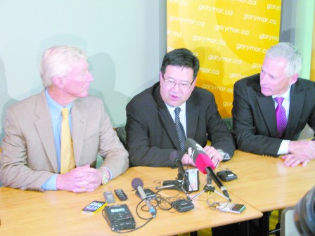 阿爾伯達省保守黨領袖候選人馬健威周一在卡加利舉行記者會﹐前對手莫頓(左)與奧曼(右)在席上表態(tài)支持他。