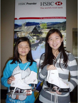 14歲鄭倩怡(右)、12歲鄭琛怡(左)姐妹,請陳偉群在自己的熘冰鞋上簽名。