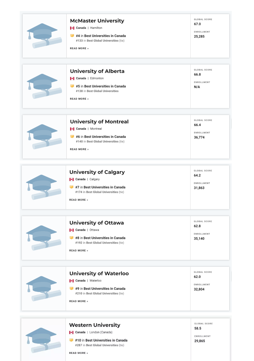 加拿大排名第4到第10位的大學依次為:麥克馬斯特大學、阿爾伯特大學、蒙特利爾大學、卡爾加里大學、渥太華大學、滑鐵盧大學、韋仕敦大學。