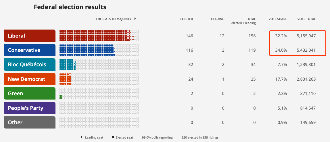 在選票方面,保守黨則贏了至少543萬張選票,占34%;比自由黨多近28萬張。