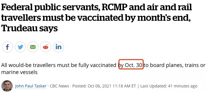 近日加拿大總理特魯多官宣了聯(lián)邦政府的強(qiáng)制性疫苗政策:在10月30日前,所有潛在旅客也必須全面接種疫苗后,然后才能登上飛機(jī)、火車或輪船;同時(shí)要求聯(lián)邦公務(wù)員月底前必須接種疫苗,否則勒令休無薪假。