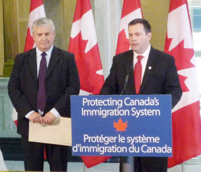 移民部長康尼(右)宣布實施新規(guī),嚴厲打擊非法或違法的移民中介。圖左為移民顧問監(jiān)管委員會主席穆尼