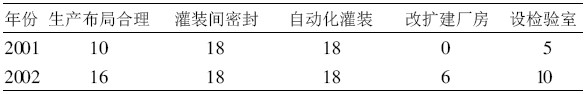 2.4 企業(yè)中檢驗(yàn)室的設(shè)立 在檢查的18 戶企業(yè)中, 2001 年只有5 家企業(yè)設(shè)立了檢驗(yàn)室, 2002 年設(shè)立檢驗(yàn)室的企業(yè)有10 戶, 自檢比例明顯提高。