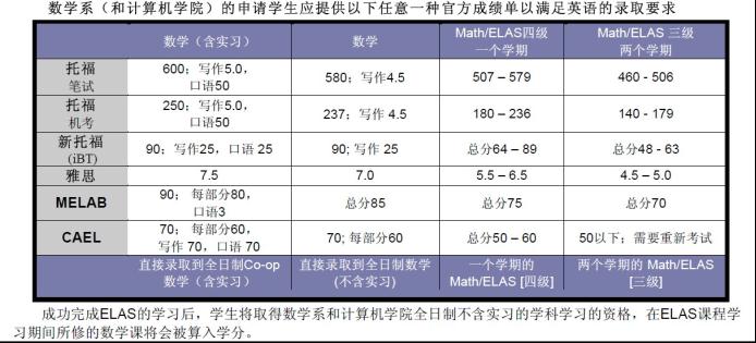 Math/ELAS課程是專為英語非母語,英語語言能力低于數(shù)學(xué)系全日制學(xué)習(xí)直接錄取標(biāo)準的學(xué)生而開設(shè)的。學(xué)生除符合所有英語以外的錄取條件,還應(yīng)該有很強的數(shù)學(xué)學(xué)術(shù)背景,并且有興趣在滑鐵盧大學(xué)的數(shù)學(xué)系或計算機學(xué)院學(xué)習(xí)。數(shù)學(xué)系和計算機學(xué)院的申請者必須提供以下任意一種英語語言考試的官方成績單:托福(TOEFL),密執(zhí)安英語語言評估測試(MELAB),雅思(IELTS)或卡爾加拿大學(xué)術(shù)英語評估測試(CAEL)。被數(shù)學(xué)系或計算機學(xué)院錄取,但英語成績低于最低錄取標(biāo)準的學(xué)生,也許會被錄取到ELAS進行英語強化學(xué)習(xí)。在Math/ELAS就讀的學(xué)生同時會在滑鐵盧大學(xué)數(shù)學(xué)系或計算機學(xué)院根據(jù)將要就讀的專業(yè)而選修一門數(shù)學(xué)必修課,這門課將會被算入學(xué)分。與此同時,學(xué)生將通過一個或兩個學(xué)期在康尼斯嘉學(xué)院(Conestoga College)的學(xué)習(xí)來提高英語語言能力。